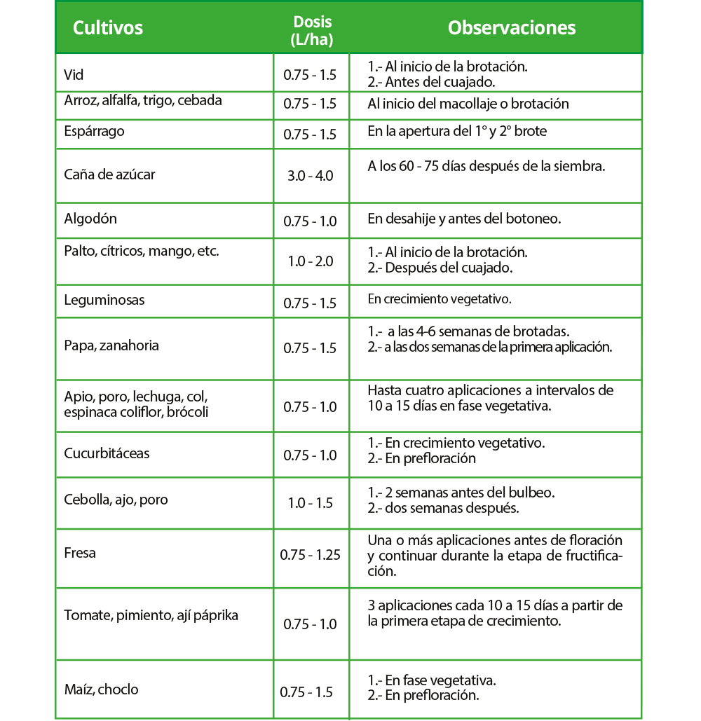 Magnesio (Mg) 10.00%, Nitrógeno (N) 10.80%, Zinc (Zn) 0.50%, Cobre (Cu) 0.02, Ácidos Húmicos 0.20%, Ácidos Carboxílios 4.0%, Aminoácidos Libres 0.10%.