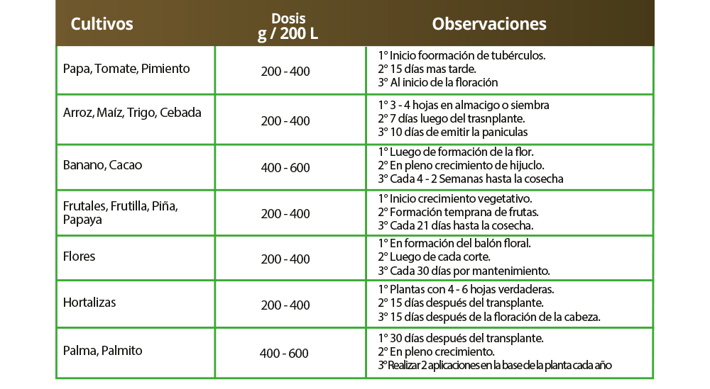 Materia orgánica 40.00 – 60.00 %, Nitrógeno total 0.70 – 1.50 %, Fósforo (P2O5) 0.20 – 1.10 %, Potasio (K2O) 17.00 – 22.00 %, Magnesio (Mg) 0.20 – 0.60 %, Calcio (Ca) 0.20 – 0.50 %, Sodio (Na) 2.50 – 4.00 %, Hierro (Fe) 100 – 350 ppm, Manganeso (Mn) 5 – 40 ppm, Cobre (Cu) 6 – 10 ppm, Zinc (Zn) 15 – 50 ppm.